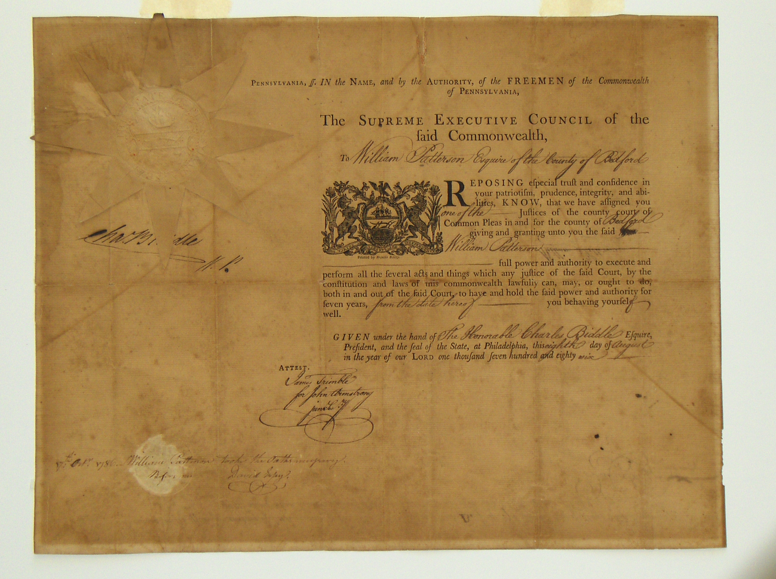 Justice of Bedford County 1786 certificate (very large file >1.5MB)
