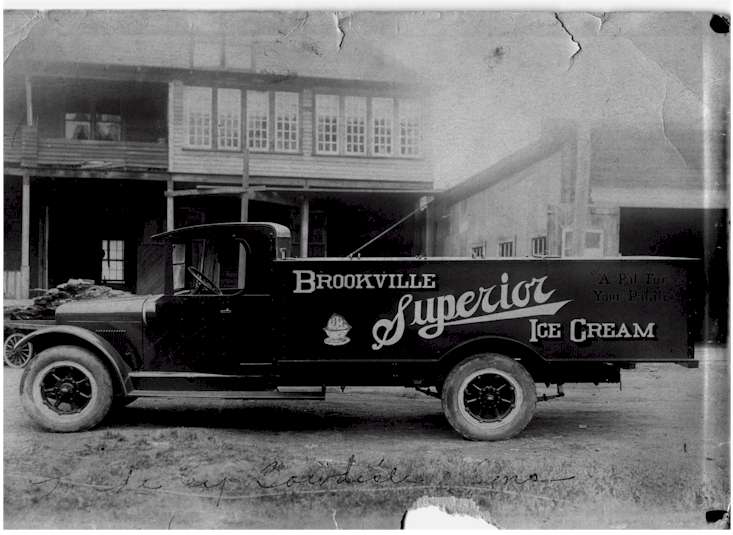 A truck belonging to Brookville Superior Ice Cream, the predecessor of the Brookville Creamery. The back of the picture identifies the truck as a 1922 Reo. The writing at the bottom of the picture reads "Made by Bowdish and Sons". Contributed by Bill Mohney |