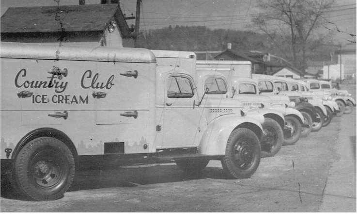 Brookville Creamery trucks that delivered Country Club Ice Cream and other dairy products parked on Water Street across the Creamery and store. The building at the far right is Reed's Mill. In the background is the old Pickering Street bridge across the Red Bank Creek. |
