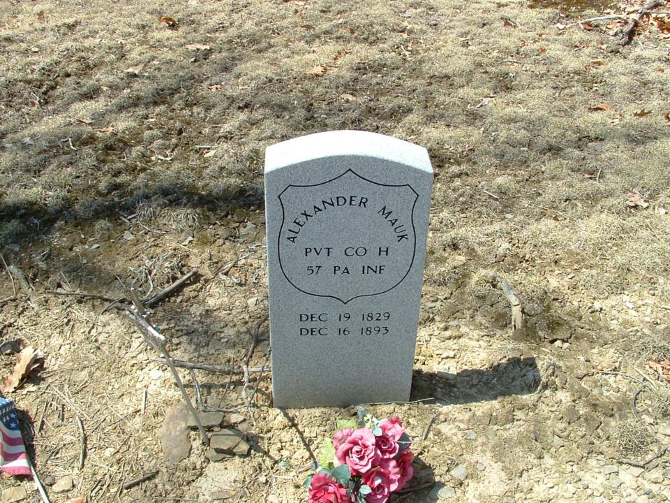 Surname First Name Date of Birth Date of Death Age at Death Notes Huffman Catherin 1821 1896 Mauk Alexander 19 December 1829 16 December 1893 Pvt Company H 57 PA Inf Reed Samuel 21 March 1846 34 years 1 month 2 days There are atleast 24 graves that are marked with field stones or plain white crosses.