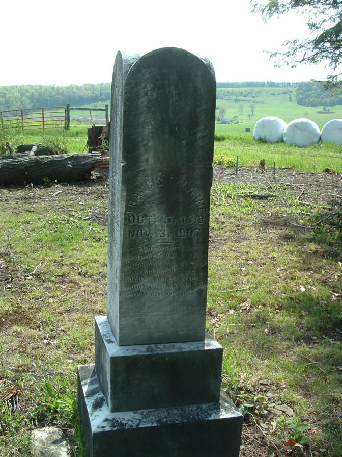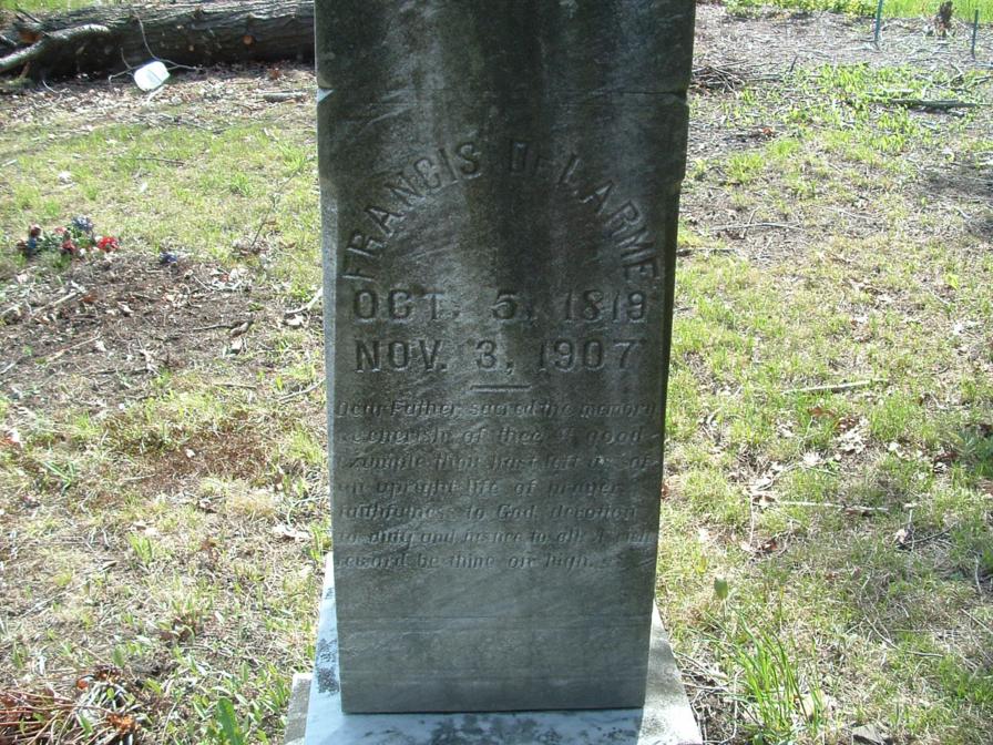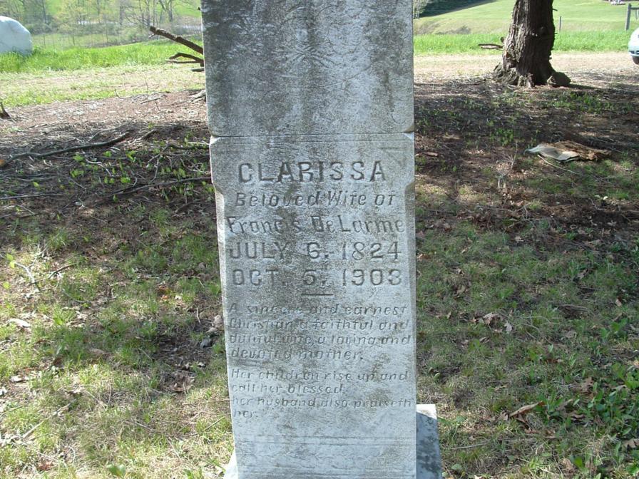 Row Plot Surname First Name Middle Name Other Name Date of Birth Date of Death Age at Death Notes 1 1 Kiel Jacob C 1861 1940 1 1 Kiel Annie E 1862 1946 1 2 Kiel Infant 29 ?? 1885 Children of J.C. & A.E. Kiel 1 2 Kiel Daisy 27 February 18?? 26 September 1886 Children of J.C. & A.E. Kiel 1 3 DeLarme Clarissa 6 July 1824 5 October 1903 Monument - Beloved wife of Francis DeLarme - separate headstone - Clarissa Delarme 79 years 1 3 DeLarme Francis 5 October 1819 3 November 1907 Monument - Separate headstone - Francis DeLarme Aged 88 Years 1 Month - back of Monument with historical information. 1 4 Kiel Mildred M 1890 1932 1 5 DeLarm Jennie 5 February 1866 8 November 1906 Wife of M.J.M. DeLarm