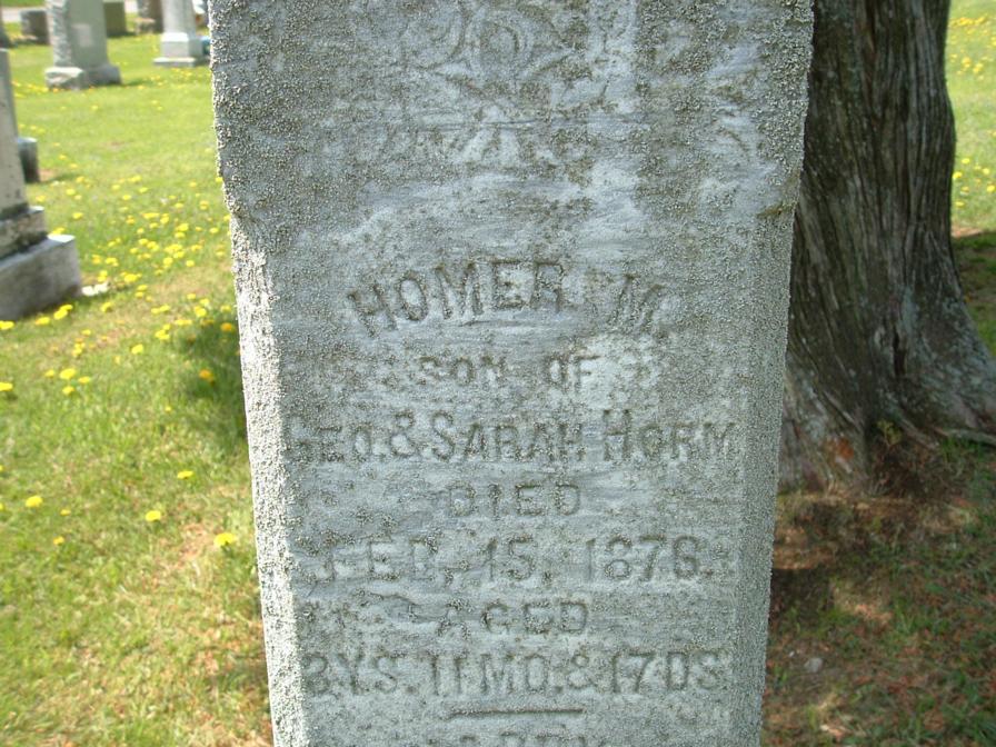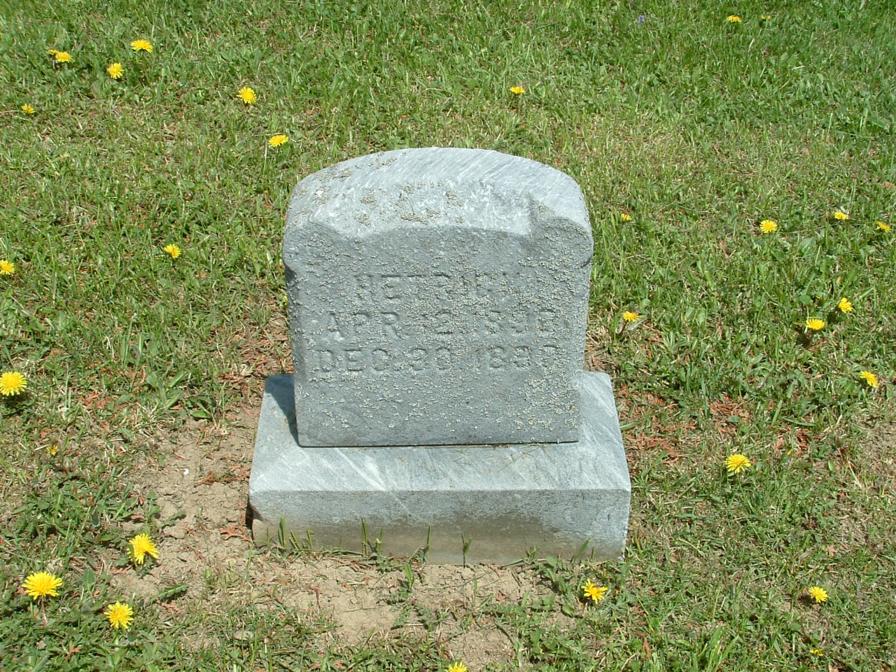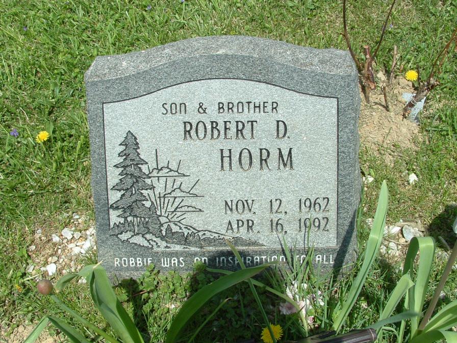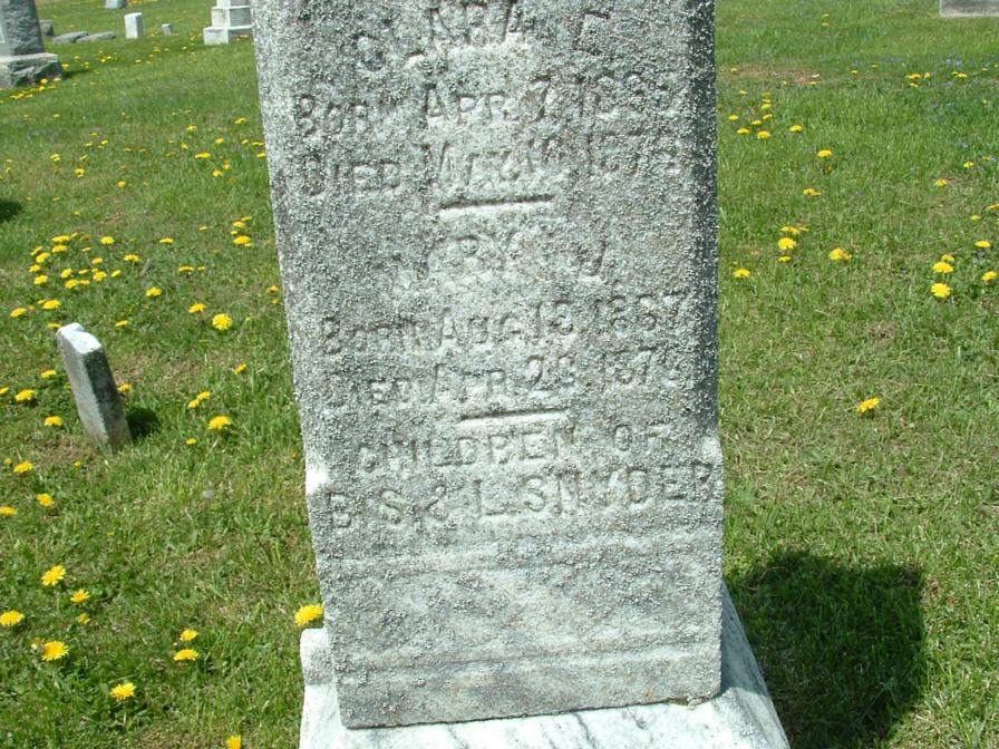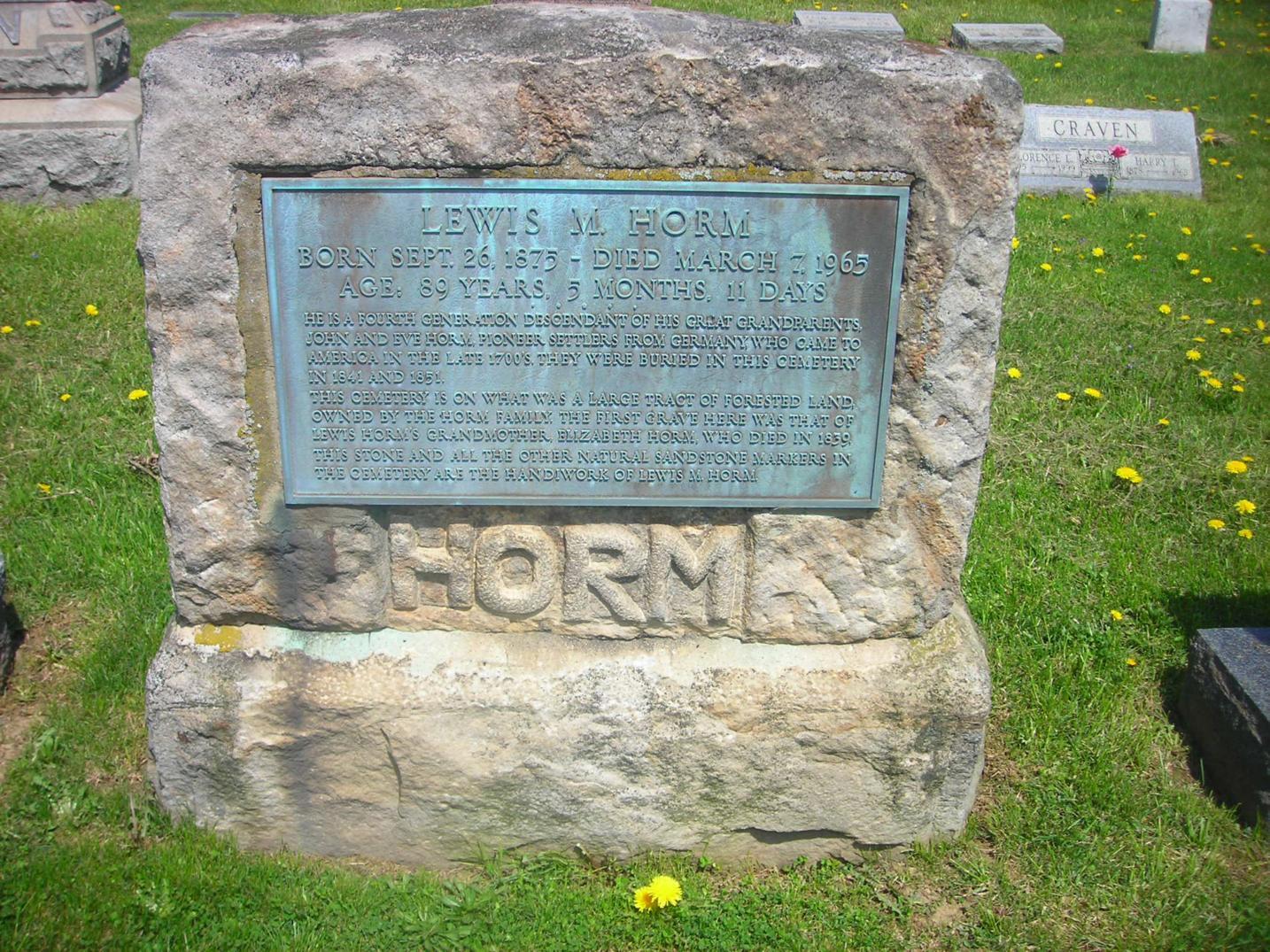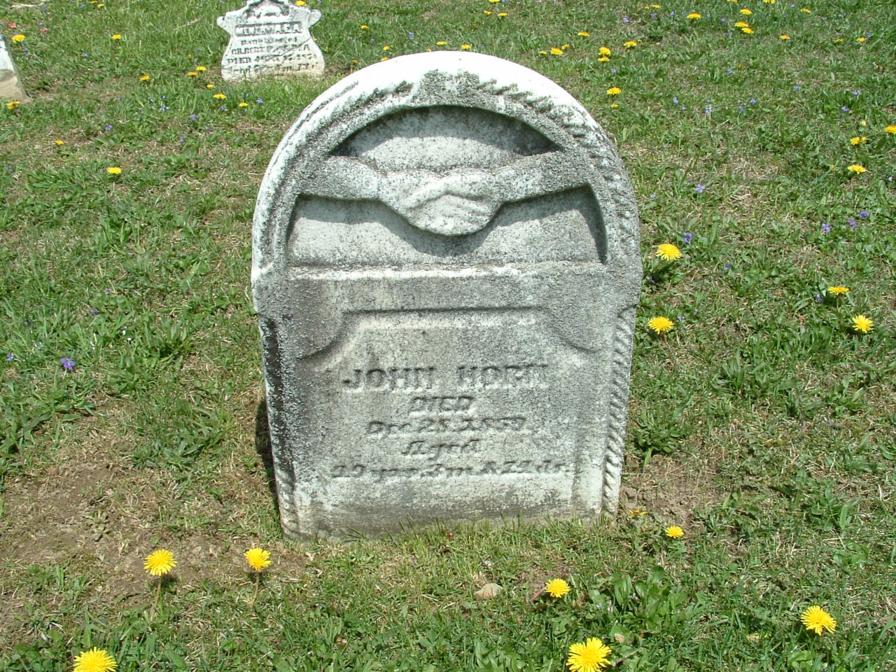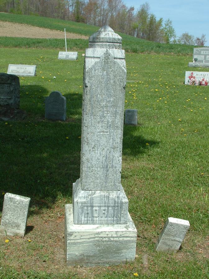 Section Row Plot Surname First Name Middle Name Other Name Date of Birth Date of Death Age at Death Notes 1 1 1 Horm Bernard 9 December 1899 1 December 1901 1 1 2 Horm Audrey 1915 1916 1 1 3 Horm Lauretta E 1881 1919 Mother 1 1 4 Horm Lewis M 26 September 1875 7 March 1965 89 years 5 months 11 days He is a fourth generation descendant of his great grandparents, John and Eve Horm, pioneer settlers from Germany who came to America in the late 1700's. They were buried in this cemetery in 1841 and 1851. This cemetery is on what was a large tract of forested land owned by the Horm family the first grave here was that of Lewis Horm's grandmother Elizabeth Horm, who died in 1839. This stone and all the other natural sandstone markers in the cemetery are the handiwork of Lewis M. Horm. 1 1 5 Doverspike Carmen Horm 1902 1980 Monument 1 1 5 Doverspike Charles A 1887 1935 Monument 1 1 6 Horm Mary 1857 1924 1 1 7 Horm Scott M 31 March 1880 14 April 1908 1 1 8 Horm Sherry Ann 1945 1950 1 1 9 Heller Ramona M 8 September 1923 9 April 2004 1 1 10 Pantall Infant Infant daughter of S.W. Pantall 1 1 11 Kennedy Mildred Horm 1903 1953 1 1 12 Horm June I 10 June 1913 16 September 1990 1st Lt. Army Nurse Corps 1 2 1 Beck Cleveland 6 September 1885 13 December 1965 1 2 1 Beck Mary 15 March 1898 31 December 1963 1 2 2 McAninch Lydia S 12 September 1917 20 November 1989 Daughter 1 2 3 Craven John A 16 June 1854 9 October 1902 1 2 3 Craven Sara Jane 10 July 1857 13 October 1945 1 2 4 Craven Florence L 1895 1999 1 2 4 Craven Harry T 1878 1963 1 2 5 Craven Flora N 4 August 1901 23 years 1 month 4 days Wife of H.T. Craven 1 2 6 Shoemaker Peninnah 20 February 1890 85 years 7 months 2 days His Wife 1 2 6 Shoemaker John 7 February 1898 90 years 6 months 1 2 7 Shoemaker Ellis M 1841 1919 1 2 7 Shoemaker Jennie P 1858 1951 His Wife 1 3 1 Burkett Sally M 1887 1976 1 3 1 Burkett James A 1883 1970 1 3 2 Snyder Mable E 1885 1960 1 3 2 Snyder Harry C 1885 1975 1 3 3 Schuckers Merle F 1904 1905 1 3 4 Schuckers Cora M 1905 1907 1 3 5 Schuckers Twins 1910 1 3 6 Schuckers Sarah H 1881 1955 1 3 6 Schuckers William F 1874 1947 1 3 7 Schuckers Elsie S 1892 1961 1 3 8 Schuckers Harry F 1877 1960 1 3 9 Unknown inscription is totally eroded 1 3 10 Schuckers Franklin 19 January 1889 44 years 3 months 28 days footstone with F.S. 1 3 10 Schuckers Ella E 1 May 1886 15 years 7 months 5 days footstone with E.E.S. 1 3 10 Schuckers Matilda 22 March 1849 30 April 1933 1 3 11 Schuckers Oscar G 1880 1928 1 4 1 Kroh Arthur W 2 June 1912 21 August 2002 1 4 2 Swab Jacob Henry 1898 1962 1 4 3 Burkhouse Sarah M 1865 1934 1 4 4 Burkhouse William H 1861 1940 1 5 1 Kroh Dorothy K 23 January 1919 2 October 2004 1 5 1 Kroh Annabelle D 23 November 1915 8 November 2004 1 5 2 Kroh Frank B 15 December 1879 12 March 1977 1 5 2 Kroh Minnie A 19 May 1881 3 March 1954 1 5 3 Hetrick Ella 1878 Daughter of D.A. & M.E. Hetrick 1 5 4 Schuckers Leona 1931 1 5 5 Schuckers Hazel 1934 1944 1 5 6 Schuckers Marena 1911 1999 1 5 6 Schuckers Walter D 1908 1983 1 6 1 Reed Twila E Smith 3 December 1892 4 January 1919 Wife of Roy Reed 1 6 2 Smith Jonathan 1845 1920 1 6 2 Smith Sarah A Swab 1858 1923 His Wife 1 6 3 Smith Minnie S 1888 1912 Wife of Galon Smith 1 6 4 Smith Christina Reitz 6 February 1841 14 November 1876 15 year 9 months 8 days Daughter of John and Mary Reitz and wife of Samuel B. Smith 1 6 5 Smith Infant 1912 Son of Galon & Minnie Smith 1 6 6 Smith William 1857 1905 1 6 7 Smith John B 15 August 1855 12 May 1880 24 years 8 months 27 days Son of Philip & Sarah Smith 1 6 8 Smith Sarah B 11 February 1890 71 years 11 months 11 days Wife of Philip smith 1 7 1 Smith Galon S 1889 1968 Co A 320 Inf WWI 1 7 1 Smith Cora E 1895 1988 1 7 2 Smith Jonathan 1897 1970 1 7 3 Raybuck Tory E Smith 1894 1975 1 7 4 Smith Farmer 1890 1980 1 7 4 Smith Alma M 1902 1984 1 7 5 Jones George Burkett 1905 1957 1 7 6 Burkett Emma 1868 1908 Wife of John M. Burkett 1 7 7 B M L 1 7 8 B L E 1 7 9 Burkett Mary E 1846 1933 seperate stone with M.E.B. 1 7 9 Burkett Peter 8 May 1892 51 years 3 months 1 8 1 Horm Leslie L 1881 1951 1 8 1 Horm May J 1885 1964 1 8 2 Thompson Albert L 1904 1987 1 8 2 Thompson Myrtle M 1905 1988 1 9 1 Bliss Sebastian 1853 1930 1 9 1 Bliss Rebecca 1862 1934 1 9 2 Bliss Harry L 1887 1980 PFC US Army World War I 1 9 3 Hice Samuel 1861 1889 1 9 3 Hice Sarah 1878 1 9 4 Burkett David E 21 January 1943 5 October 1944 Baby 1 9 5 Hetrick Paul A 1907 1948 Son 1 9 6 Hetrick Clay G 1914 1957 Son 1 9 7 Hetrick Margaret E 1883 1942 Mother 1 9 8 Hetrick Charles A 1877 1960 Father 1 10 1 Cathers Myron M 25 August 1902 22 March 1985 BM 1/C US Navy WWII 1 10 2 Cathers Robert J 26 February 1918 26 September 1994 MM 1/C US Navy WWII 1 10 3 Reed Martha F 29 December 1908 27 May 1998 1 10 4 Cathers Arminta 20 February 1880 11 September 1971 1 10 5 Schuckers Levi E 1913 1965 1 10 5 Schuckers Ahlene E 1911 2000 1 10 6 Sayers Alberta F 1912 1969 1 10 7 Smith Albert L 1883 1965 1 10 7 Smith Emily S 1885 1968 1 10 8 Hetrick Harold E 1910 1974 1 10 8 Hetrick Margaret E 1915 1 11 1 Fisher James F 1913 1963 1 11 1 Fisher Elizabeth J 1921 2002 1 11 2 Snyder Lawrence E 1903 1981 1 11 3 Snyder Darwin L 1926 1994 1 11 4 Keller Eileen D Snyder 1933 1 11 5 Keller Ricky R 1955 1993 1 11 6 Kroh Wayne E 1908 2002 Married 4 September 1938 1 11 6 Kroh Nora O 1916 Married 4 September 1938 1 11 7 Mowrey Homer J 14 October 1924 13 January 2000 Vet. US Army WW2 1 11 7 Mowrey Laura M 16 May 1920 1 12 1 Smiley Florence E Horm 1913 2004 Beloved Mom & Gram 1 12 2 Tonell Susan L 9 May 1969 1 12 3 Tonell William A 1924 2002 SSgt US Army WWII 1 12 3 Tonell Delma M Smith 1926 1 12 4 Peters James E 14 November 1918 14 July 1985 Vet USN WW2 1 12 4 Peters Nelda E 2 January 1930 1 12 5 Reed E Irene Snyder 1923 Married July 20, 1945 1 12 5 Reed H Eugene 1917 1990 Vet. WW2 - Married July 20, 1945 1 12 6 Reed Jeffrey Lynn 16 June 1962 19 May 2004 2 1 1 Beck Herman J 19 July 1890 15 February 1979 4 Div 47 Inf. SUP Co., WWI 2 1 2 Beck An