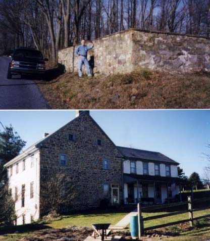 Above is a photo of the STERN CEMETERY. The person in the photo is Robert Christian Reichard, son of Edna Eby Stern Reichard. The house, as it appears in 1998, was built on the Stern Farm in 1802. This home and cemetery is located in Mount Joy Township, Lancaster County, Pennsylvania. It is on Trail Road, approximately 1 mile north of the Elizabethtown Road, leading to Manheim, Pennsylvania. Many footstones are in a corner inside the cemetery. A list of these is included in this transcription. Many of the entries are in German, and will be included here.