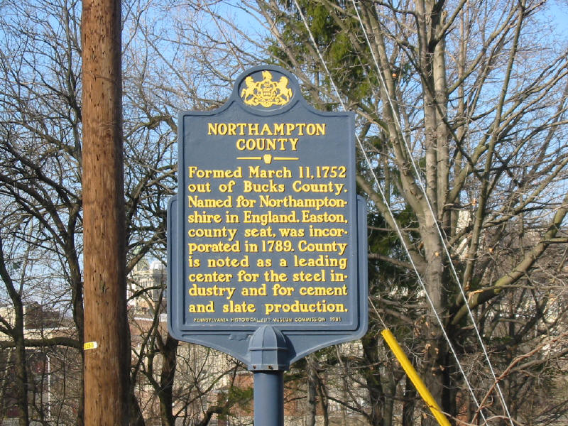 Formed March 11, 1752 out of Bucks County. Named for Northamptonshire in England. Easton, County Seat, was incorporated in 1789. |