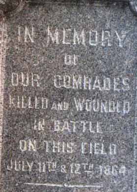 Plaque on West side of the Monument: Killed in battle, July 11th and 12th, 1864: Plaque on East side of the monument: Wounded in battle: |