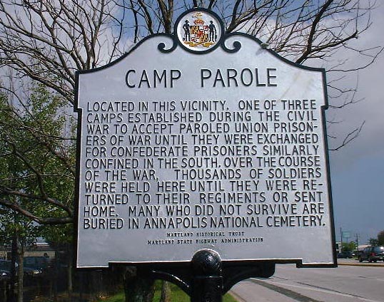 Parole is a French term meaning "word". In the days of formal warfare, it was customary to exchange prisoners of war by a complex formula of numbers and relative rank. Often, to avoid being burdened with large parties of prisoners, forces in the field would "parole" them; that is, release them to go home on oath not to perform any military service until exchanged.1 Early in the Civil War, it was discovered that many paroled men would disappear into the civilian population, not to be found when ready for exchange. So keeping them under military control until exchanged and returned to their units became imperative.A "camp of instruction" for 50,000 men was established near Annapolis by War Department General Order No 59, dated June 5, 1862. Before any progress could be made on this project, it was changed by General Order No., 72, dated June 28, 1862, to a camp for paroled prisoners from New England and the "Middle States". By the end of July this camp was being referred to in official correspondence as "Camp Parole".2