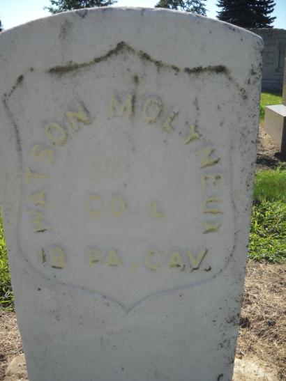 Enrolled March 24, 1864 at Troy, Pa., age 19. Mustered in March 24, 1864 as private at West Chester, Pa. Height: 5' 4", Hair: Dark, Complexion: Dark, Eyes: grey. Occupation: Farmer. Born: Bradford County, Pa. Residence: Bradford County, Pa.He was transferred out on June 24, 1865 at Cumberland, Maryland The same day he transferred to Company F, 3rd Pa. Provisional Cavalry.Mustered out October 31, 1865. Applied for pension June 4, 1890. Application No. 376,309.Certificate No. 312,195. He is listed as a prisoner of war, but date and place not stated.