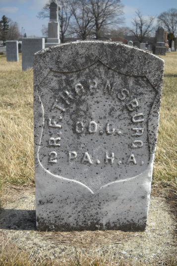 Enrolled March 29, 1864 at Meadville, Pa., age 21. Mustered in April 15, 1864 as Private at Pittsburgh. Height: 5' 6.5", Hair: Brown, Complexion: Dark, Eyes: Hazel; Occupation: Laborer; Born: Clairmont, Pa. Mustered out with battery, January 29, 1866; Veteran.Applied for a pension October 31, 1890, Application No. 948,535; his widow'sApplication No. 571,750, Certificate No. 399,906.