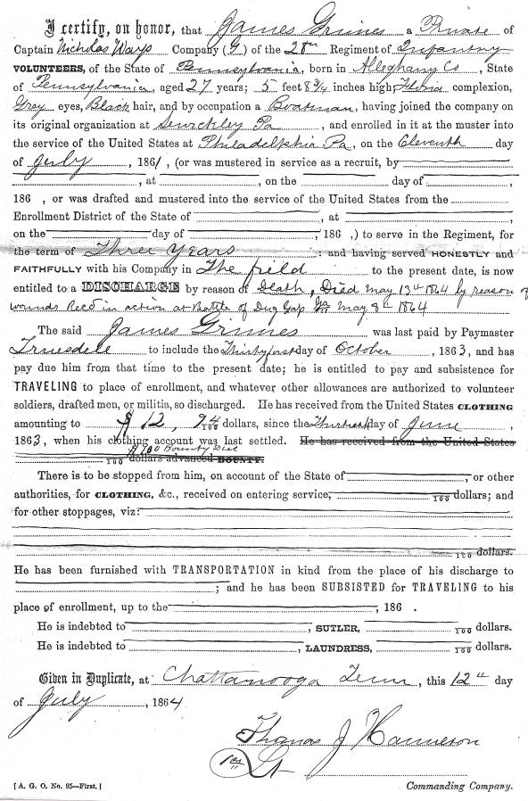 James Grimes Company G 28th Pennsylvania Volunteers