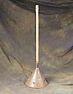 The hand washer is an odd-looking device that mystifies many people seeing one for the first time. imagine a large, upside-down tin funnel with a broom handle inserted into the drain hole. Looking at the underside of the cup on top, you’ll see a pattern of chutes and holes that allows water to pass through. Back when hand washers were used to clean clothes, pots of water would be set over fires outside. The water was then collected in the cup, while the long, wooden handle helped keep hands from getting burnt. Finally, a system of chutes in the metal section was used to churn and agitate the contents. Hand washers were manufactured and used from the early 1900s up until the 1930s, when mechanical washers became more common.