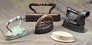 Old Irons for Pressing Clothes: Fighting wrinkles has been a preoccupation since the beginning of civilized life. As a result, irons have been a household necessity for centuries. Collectible irons were made from the mid-1800s up to the 1950s. The first irons were just that - a heavy chunk of iron with a handle. They were kept in a fire until hot, then removed to press the clothes. Irons cooled rather quickly, so many women kept more than one iron in the fire at any given time. Some of the fancy earlier models had handles that could be swapped out and used with different bases. Coal-powered irons eventually replaced these models, with a hollowed-out base where hot coals were inserted. The early electric irons are also good-looking, and are becoming more popular as collectibles.