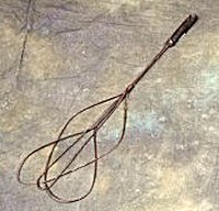 Old Rugbeater: A rug beater is one of those things that lots of people recognize. Most were made either of twisted wire or a wicker-like twisted wood, with a handle attached to a head shaped like that of a tennis racket. Rug beaters were used for cleaning area rugs and carpets from the 1880s through the 1920s. Rugs were hauled outside, hung over a line, and pounded on with the beater until all the dirt and dust was removed.