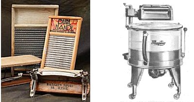 Washing Clothes: In the good old days, clothes were washed in a stream, by pounding the garments with rocks, stones and heavy sticks. Forget about soap -- water was the sole cleansing agent. Fire added heat to the laundry mix, when clothes were washed in tubs with water heated over open fires and soap made at home from a combination of lye and ashes. Clothes were scrubbed on a corrugated board, wrung by hand, rinsed, then rung again, and draped on lines or bushes to dry.I grew up in the 1930s at a time when we still had an icebox for refrigeration and my job was to daily empty the pan under the icebox where the water was collected. In the 1920s my mother was using using a washboard. She thought she was in heaven when we were able to buy an electric washer with a hand wringer in the early 30s. As a young boy, after she had wrung out some of the water by hand, I would sometimes help feed them through the two wringers and turn the handle. Washers with hand wringersfrom the 1920s and 1930s.