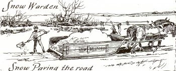 Instead of plowing the snow away as we do today, snow rollers packed it down and everyone traveled on top. One of the town's most important jobs was that of snow warden. He was the man who supervised "road packing" and, oddly enough, was responsible for covering the bare shots with snow. The whole northern country moved by sled in winter, and a bare spot on a snow-covered road became a frustrating roadblock. The snow warden's most tiring job was to "snow-pave" the bridges so sleds could pass through. This, of course, explodes the theory that bridges were covered to keep them free of snow.