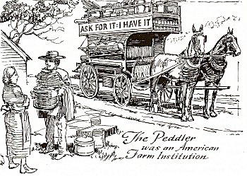 Another vanished knight of the road is the old-fashioned peddler whose home and shop was his wagon. He both bought and sold as he went, often selling his stock, wagon and all. Starting anew, with a few wares on his back, he invariable returned with a new horse and wagon and a tidy profit besides.