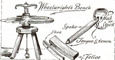 That enormous weights could speed over the rough roads of yesteryear on wooden wheels much slenderer than modern bicycle tires and without any metal fastenings seems almost miraculous. Black or sour gum for hubs, oak or ash for spokes, hickory for felloes, beech or fresh ash for axles, oak for framing, and popular for paneling were some of many combinations of wood that made up a lasting wagon. Such combinations were the "secret recipes" of the old wheelwright and he made every effort to keep them secret, as he hid his method of seasoning.