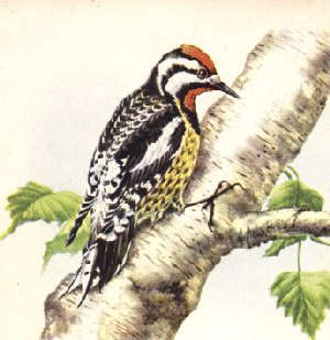 The Yellow-bellied Sapsucker does exist and it does feed on sap. This woodpecker drills rows of holes in the tree bark and visits them periodically to eat the sap that oozes out. Damage to the tree is minor. This species is common in the northern and eastern parts of the United States.