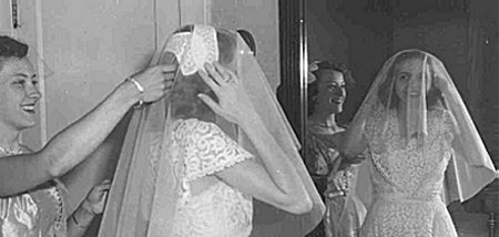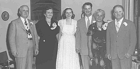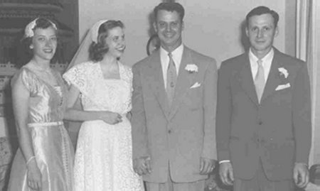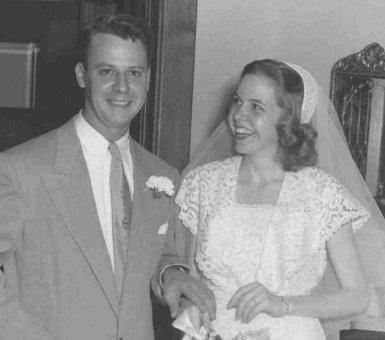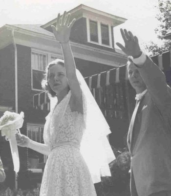 We were married on June 21, 1953 which turned out to be a humid day in the mid-nineties. Early that morning, Frank Stevenson, my brother Tony and I went out to the old Stevenson farm to cut mountain laurel blossoms to decorate the fireplace, living room and stairs Margeet would walk down for the ceremony.The day was so hot that Betty Stevenson sprayed the top of the metal awning over the front porch several times before the ceremony.