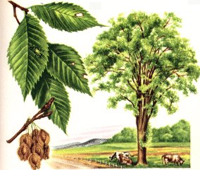 American Elm is well known, because it is one of the conspicuous trees of eastern woods, fields, and town streets. Other Elms were found in Europe, Asia, and northern Africa. Widely planted, this Elm makes an excellent shade and street tree. Now it is menaced by insect pests and the Dutch Elm disease.