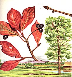 It is common along moist roadsides and in woods. Blackgum leaves (2 to 5 inches long) are smooth and shiny bruning brilliant red in fall. The dark blue fruit is eaten by birds and small mamals. A characteristic feature of Blackgum is the stiff horizontal twigs and branches. Sweetgum is not a relative despite its name.