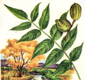Butternut, or White Walnut is a spreading tree, smaller than Black Walnut, with light gray bark that breaks into elongated flat ridges. It is a tree of stream banks, roadsides, and open woods, preferring rich, well-drained soil. The leaf, similar to that of Black Walnut, has fewer and slightly broader, more hairy leaflets.