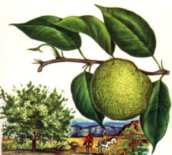 It is easily identified by its shiny leaves, thorny twigs, bright orange inner bark. The unusual, wrinkled, orange fruit, 4 to 5 inches in diameter, has a typical citrus odor, but the inside is dry and pulpy, witha milky juice. It grows from a ball of small green flowers.