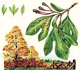 Sassafras, called Green Stick by the Indians because of its bright green twigs, is a common eastern tree or shrub with peculiar, mitten-shaped, three-lobed leaves. Some are entire, a few have two lobes, but all turn a rich orange and red in autumn. Children chew the aromatic twigs. Older people recall the teas and tonics made from Sassafras roots.