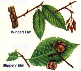 Slippery and Winged Elms are both eastern trees, though the former ranges farther north and west. Winged Elm or Wahoo has small leaves (1 to 3 in. long) and fruit. The corky outgrowths or wings on the twigs give it its name.