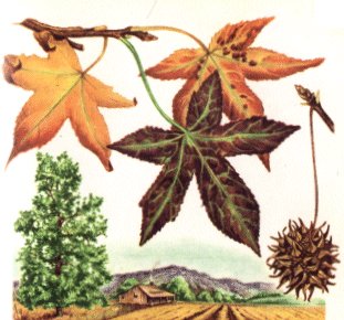 The star-shaped leaves are somewhat like those of Maple but grows alternate on the twigs. The hanging, dry fruit, a ball covered with tiny horns, opens to release mall winged seeds which are eaten by birds. The bark is thick, gray and scaly. The soft, weak, brownish wood is used for furniture, cabinetwork and veneer.