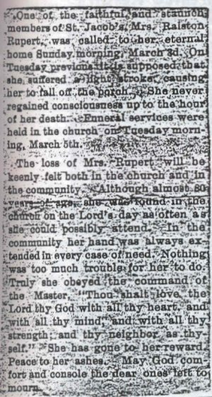 During the 1860 census, Ralston, then 19, was also listed living with his uncle Solomon Rupert in South Bend Twp. In 1880 and 1900, he and his wife were still living in South Bend Twp and his occupation was still farming. In 1910, they were in Young Twp,, Indiana Co., where they rented a farm. Grandchildren Clara and Frank Silvis were living with them in 1910.