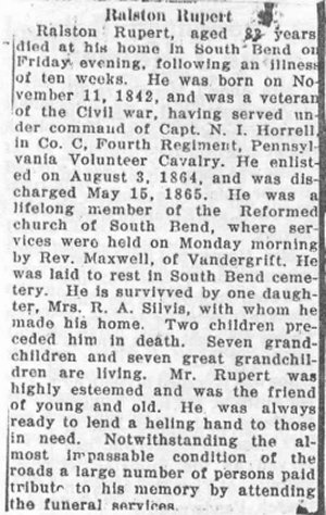 Ralston Rupert was born Sept. 11, 1842 in Armstrong County and died in South Bend March 13, 1925, and was buried in South Bend Cemetery Married Elizabeth Buckley in South Bend. Elizabeth Buckley was born 22 March 1832 in Armstrong Co. and died 3 March 1913, buried in South Bend Cemetery.
