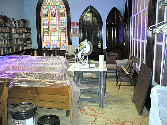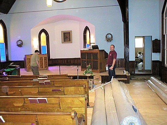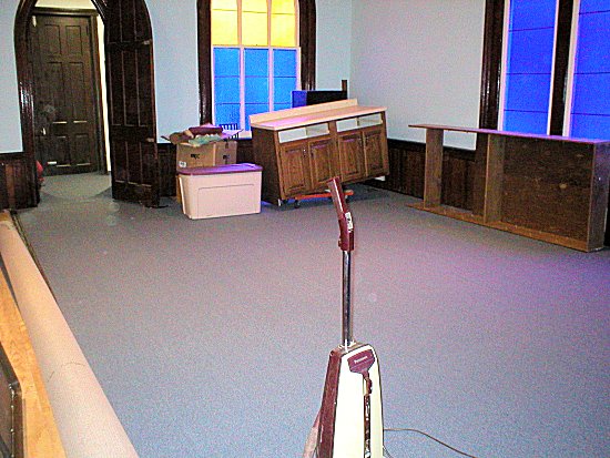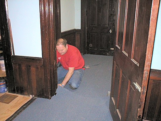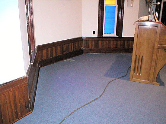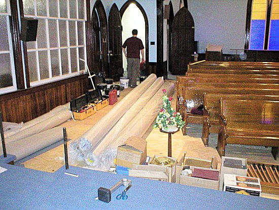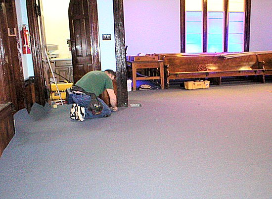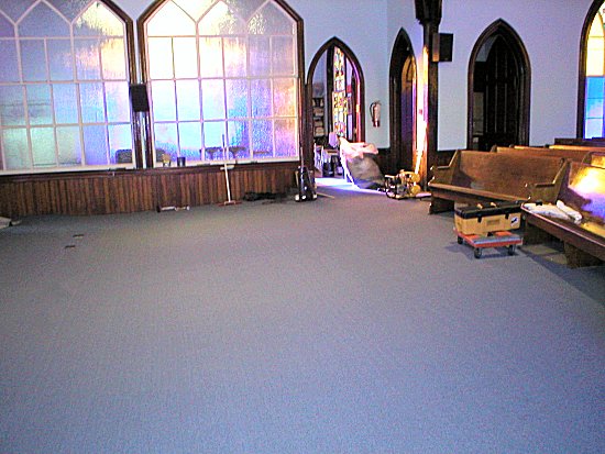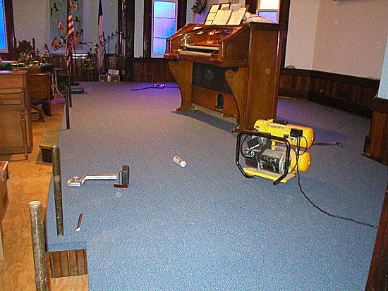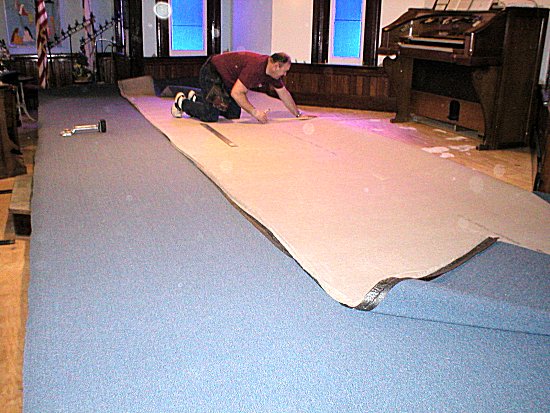 Restoration Pictures - Carpet Installation Last Piece of Carpet in the Sanctuary Narthax Sunday School Room