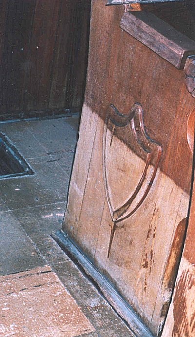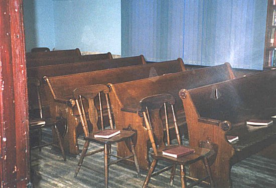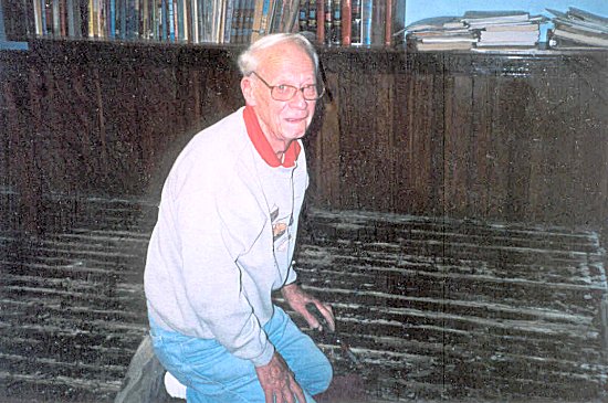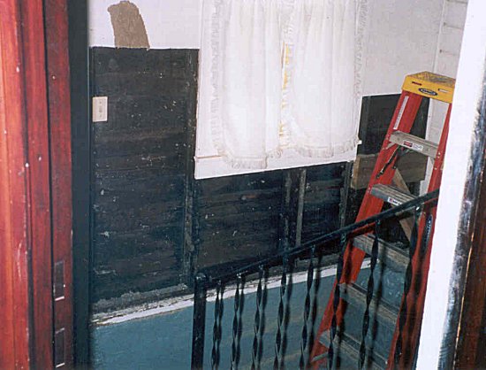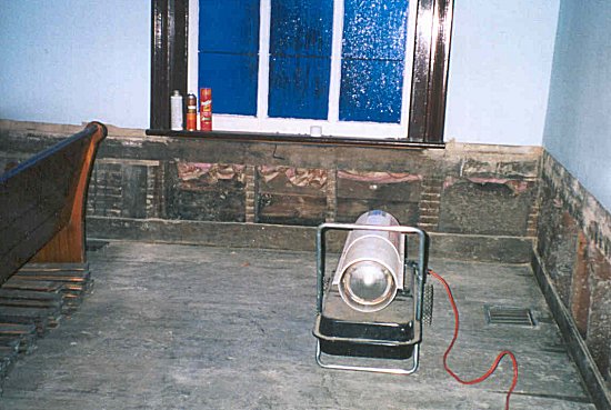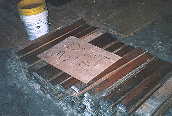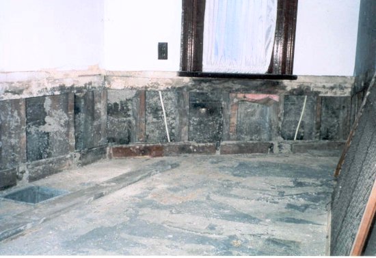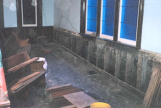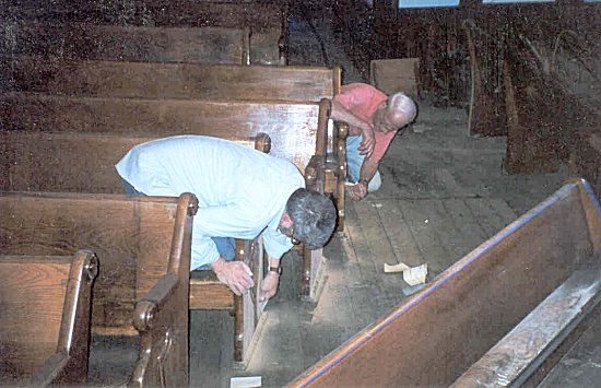 Work Day - October 16, 2004 Pictures by Kathy Townsend High Water Mark - Left Back Pew Removing Wainscoting and Wet Insulation