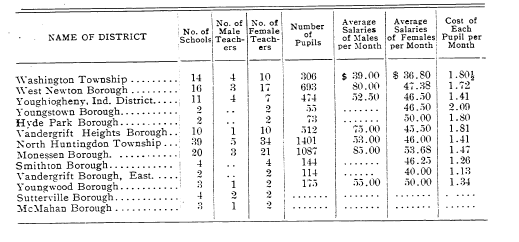 There are now 476 school houses in the county, with 863 schools. In eighty-one of these the higher branches are taught. Last year there were 918 teachers employed, of whom all but iii were experienced teachers, and 287 were teachers who had been graduated at state normal schools, while forty-one others were graduated from colleges. The average monthly wages paid male teachers was $58.54, and that paid to female teachers was $45.04. The number of pupils enrolled was 36,057. The average cost of each pupil per month was 81.42. The state appropriation, that is the amount which came to Westmoreland schools, was $137,169.92, while the amount of school tax levied for building, schoolhouses, etc., and for school purposes was $438,072.93. The total expenditure last year for all school purposes was $686,327.30.