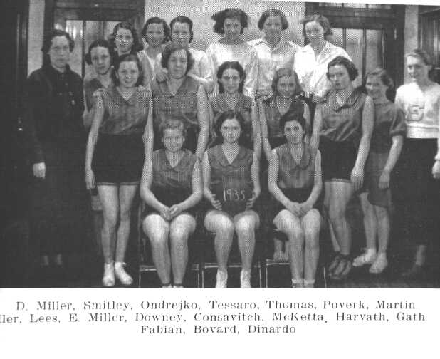 The season of 1934-35 opened with West Newton, followed by Sewickley in quick succession, both of whom defeated us without much trouble. We also played Rostraver, against whom we were not much of a match. The latter part of the season was more successful because the girls were permitted to use West Newton's gymnasium. The most interesting game of the season was the last one with Sewickley. The squad showed much improvement and great ability in holding their own.